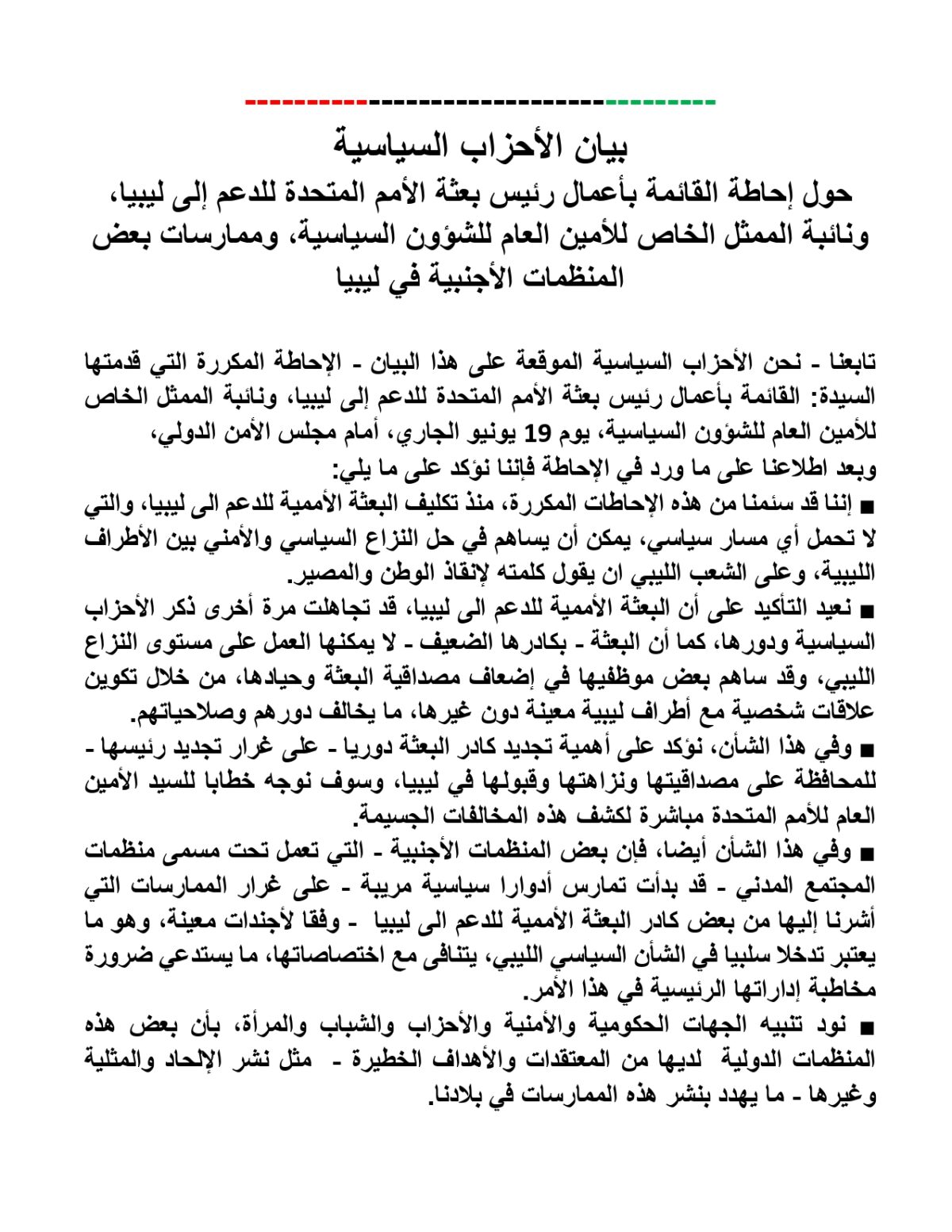 وأعاد البيان التأكيد على أن البعثة الأممية قد تجاهلت مرة أخرى ذكر الأحزاب السياسية ودورها، كما أن البعثة – بكادرها الضعيف – لا يمكنها العمل على مستوى النزاع الليبي، وقد ساهم بعض موظفيها في إضعاف مصداقية البعثة وحيادها، من خلال تكوين علاقات شخصية مع أطراف ليبية معينة دون غيرها، ما يخالف دورهم وصلاحياتهم.
