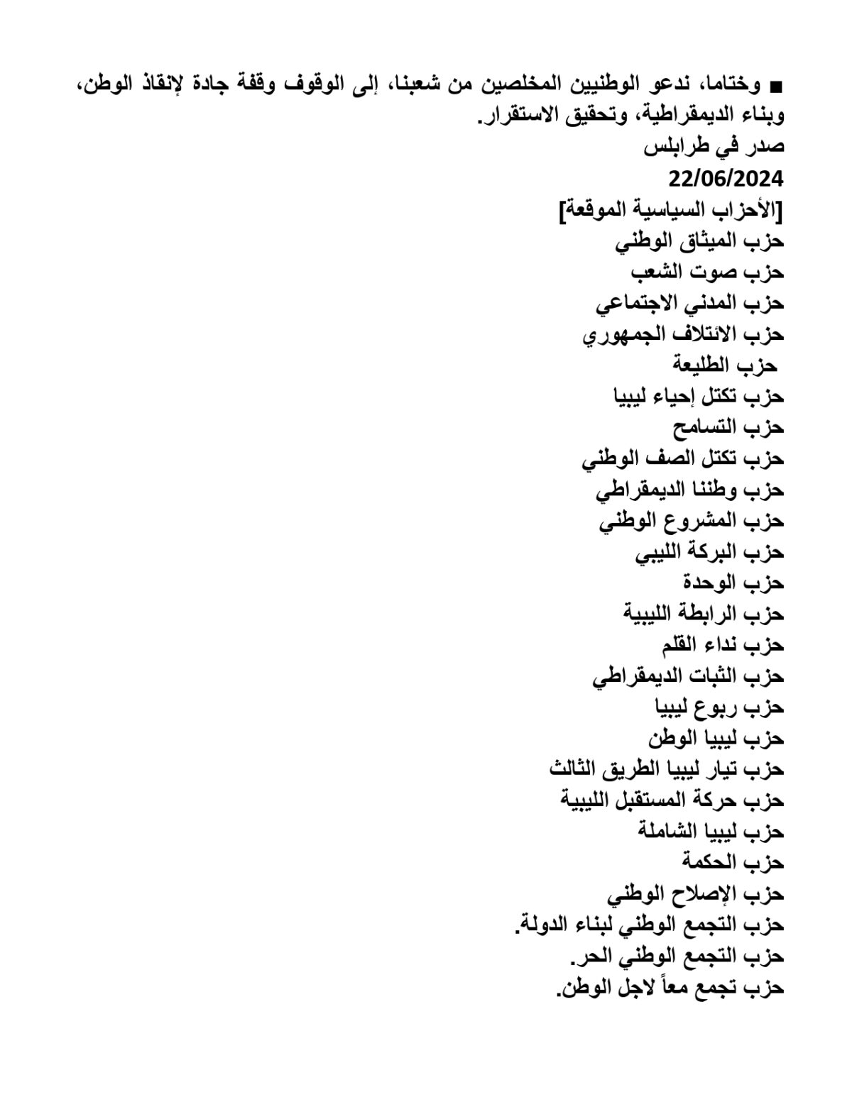 ودعت الأحزاب في ختام بيانها الوطنيين المخلصين إلى الوقوف وقفة جادة لإنقاذ الوطن، وبناء الديمقراطية، وتحقيق الاستقرار.