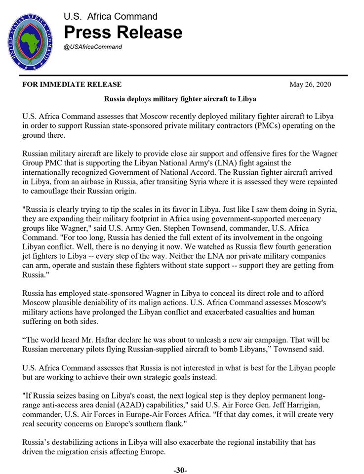 "For too long, Russia has denied the full extent of its involvement in the ongoing Libyan conflict. Well, there is no denying it now." – Gen. Townsend