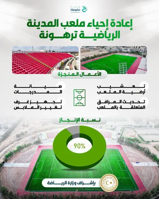 أعلنت وزارة الرياضة بحكومة الوحدة الوطنية، تواصل أعمال إعادة إحياء ملعب المدينة الرياضية ترهونة، والتي تشمل جميع مرافقه.