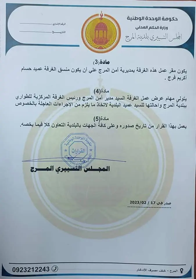 أصدر عميد بلدية المرج وليد صلهوب، القرار رقم (3)لسنة 2023م، بشأن تشكيل غرفة طوارئ ببلدية المرج وتسمى غرفة الطوارئ المركزية المرج برئاسة مدير أمن المرج العميد وهبي الرخ، وذلك بعد تسجيل هزات أرضية في المدينة خلال الأيام الماضية.