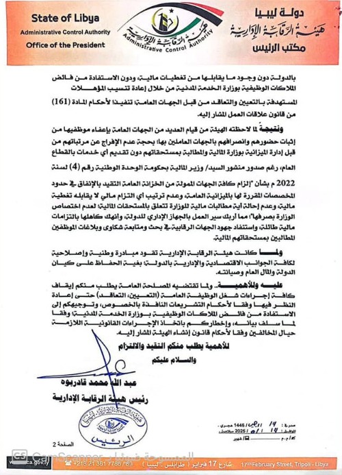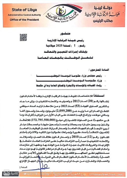 أصدر رئيس هيئة الرقابة الإدارية عبد الله قادربوه منشوره رقم (1) لسنة 2025م بإيقاف إجراءات التعيين والتعاقد لشغل الوظائف بالجهات العامة حتى إعادة النظر فيها وفقاً لأحكام التشريعات النافذة بالخصوص.