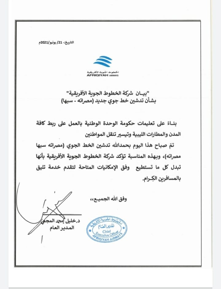 أعلنت شركة الخطوط الجوية الأفريقية، استئناف الرحلات من مطار مصراتة إلى مطار سبها وذلك بعد توقف لمدة 7 سنوات، أي منذ عام 2014، وفي انتظار موافقات رسمية للوصول إلى محطات خارجية.
