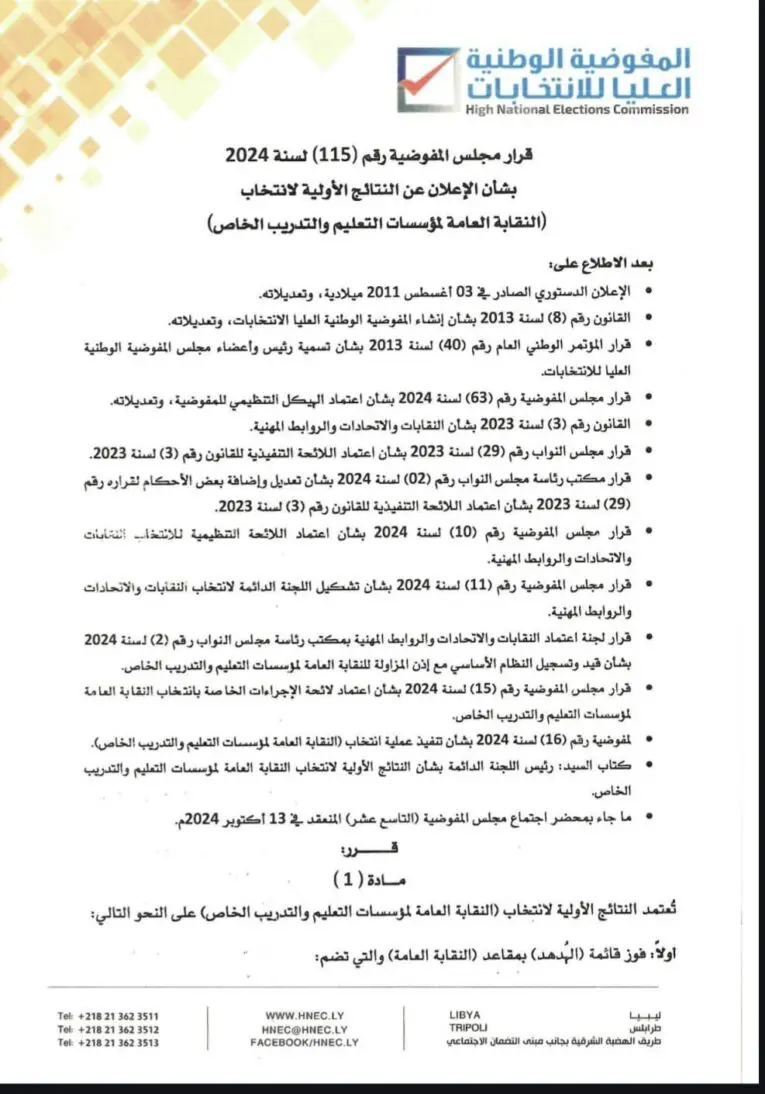 أصدرت المفوضية الوطنية العليا الانتخابات، القرار رقم (115) لسنة 2024 بشأن الإعلان عن النتائج الأولية لانتخاب النقابة العامة لمؤسسات التعليم والتدريب الخاص).