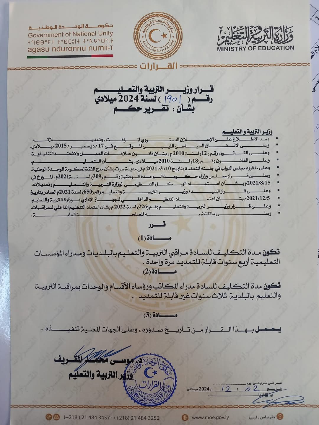 أصدرت وزارة التّربية والتّعليم بحكومة الوحدة الوطنية القرار رقم 1901 لسنة 2024م، بِشأن تحدِيد مُدّة تكليف مُراقبي التٌربية والتّعليم، ومديري المكاتب ورؤساء الأقسام والوحدات بِالمراقبات.