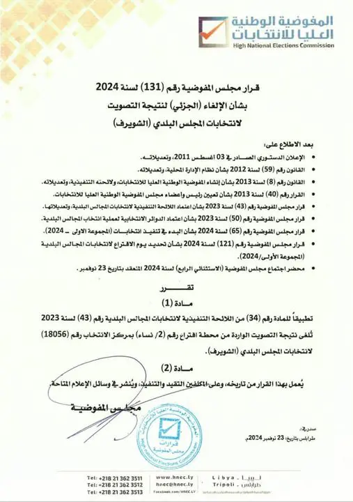 كما أصدرت المفوضية القرار رقم (131) لسنة 2024، بشأن الإلغاء (الجزئي) لنتيجة التصويت لانتخاب المجلس البلدي (الشويرف).