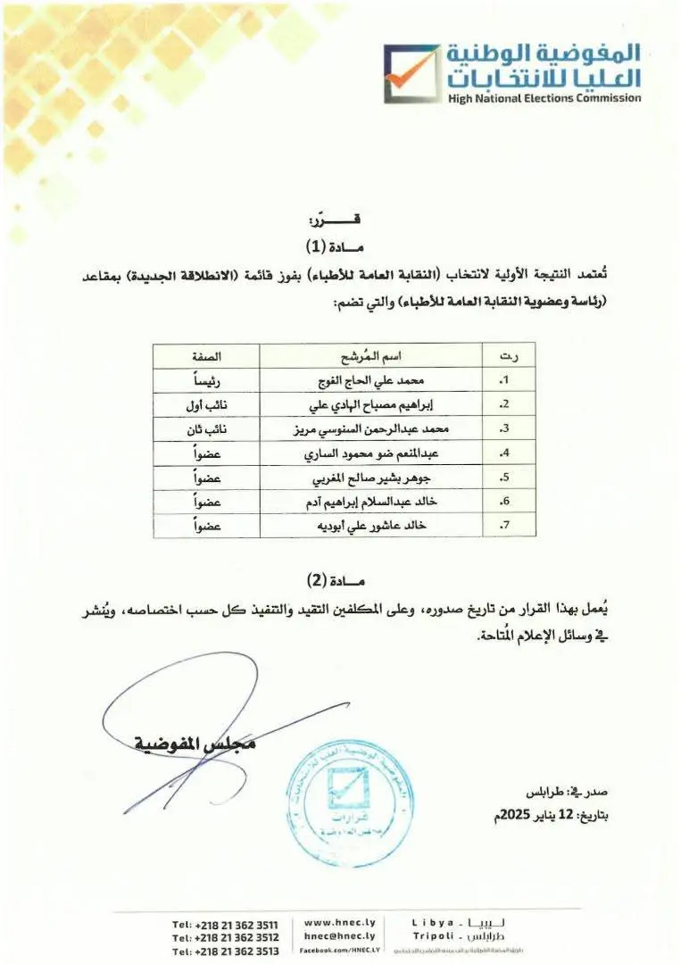 اصدرت المفوضية الوطنية العليا للانتخابات، القرار رقم (10) لسنة 2025، بشأن اعتماد لائحة الإجراءات الخاصة بانتخاب (نقابة أطباء الصحة العامة).