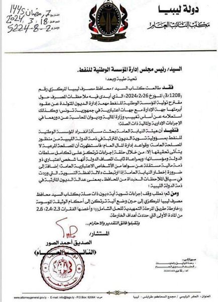 طلب النائب العام الصديق الصور، وقف إجراءات تسوية أية ديون ذات صلة بكتاب محافظ مصرف ليبيا المركزي، إلى حين وضع آلية ترتكز إلى أحكام خارطة طريق المرحلة التمهيدية للحل الشامل.