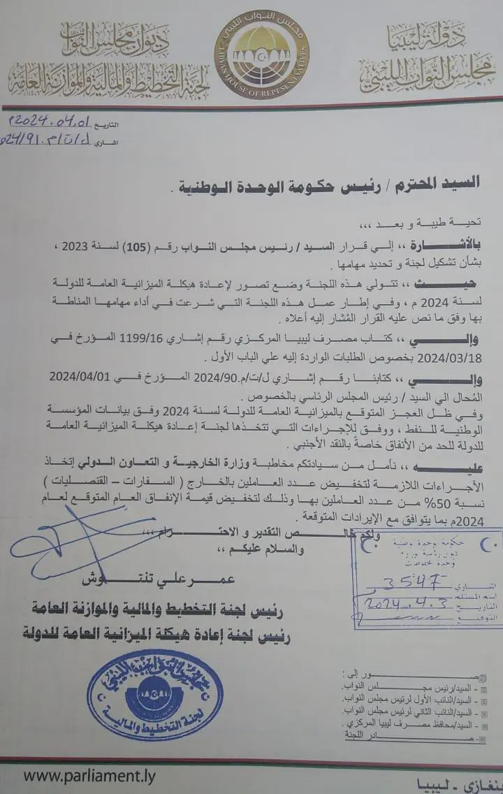 وبحسب نص الخطاب، فإن هذا الطلب يأتي في ظل العجز المتوقع بالميزانية العامة للدولة لسنة 2024 وفق بيانات المؤسسة الوطنية للنفط، ووفق للإجراءات التي تتخذها لجنة إعادة هيكلة الميزانية العامة للدولة للحد من الإنفاق خاصة بالنقد الأجنبي.