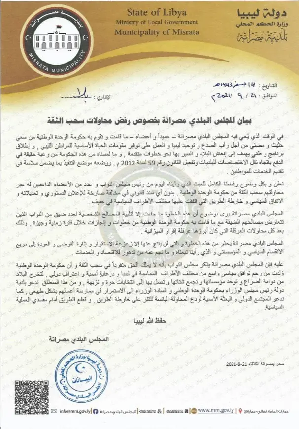 حذر المجلس البلدي مصراتة، من الخطوة التي اتخذها مجلس النواب بسحب الثقة من حكومة الوحدة الوطنية، مؤكدا أن هذه الخطوة لن ينتج عنها إلا زعزعة الاستقرار و إثارة الفوضى والعودة إلى مربع الانقسام السياسي والمؤسساتي وما نجم عنه من تدهور للاقتصاد والخدمات.