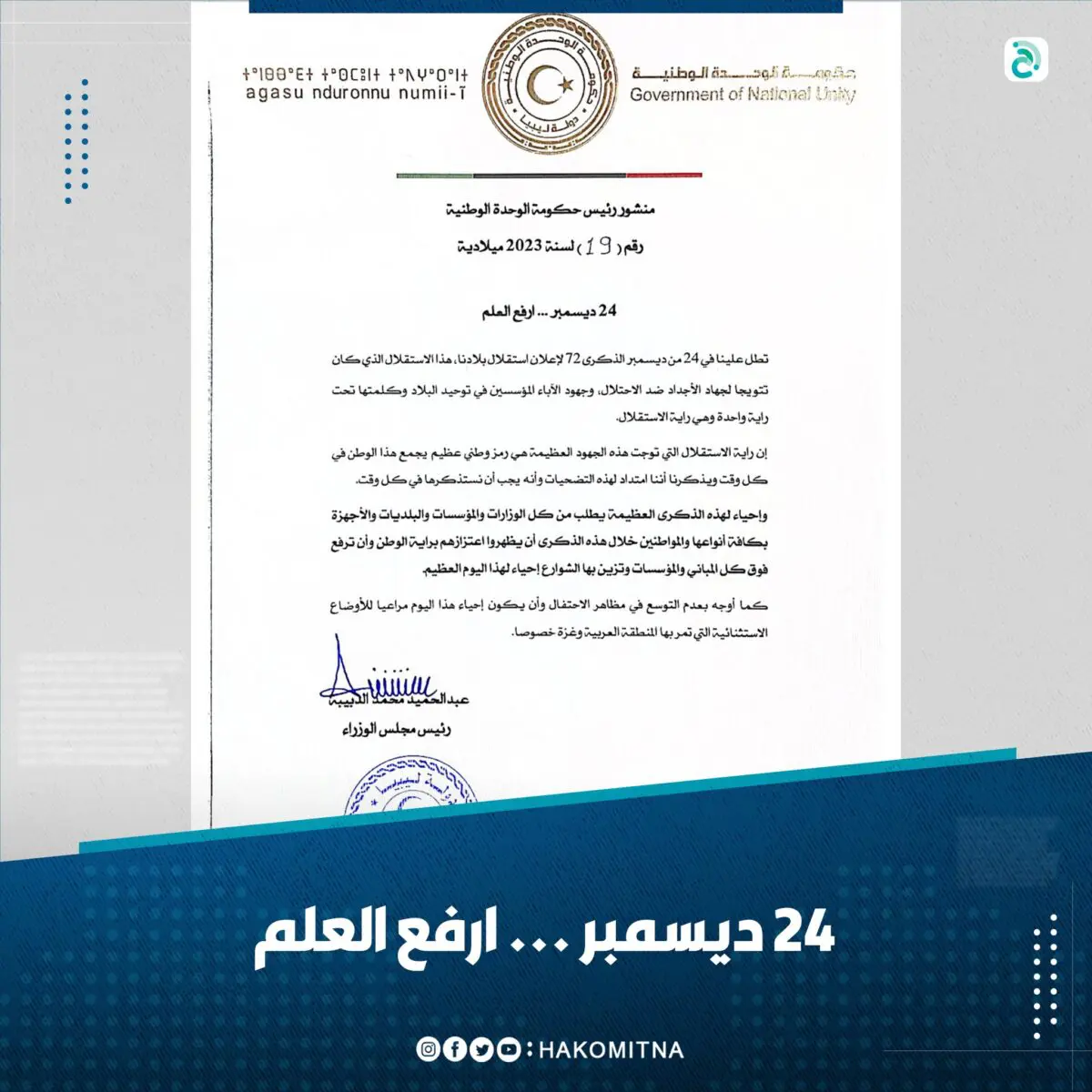وجه رئيس حكومة الوحدة الوطنية عبدالحميد الدبيبة كل الوزارات والمؤسسات والبلديات والأجهزة بكافة أنواعها والمواطنين، بإظهار اعتزازهم براية الوطن ورفعها فوق كل المباني والمؤسسات وتزيين الشوارع بها.