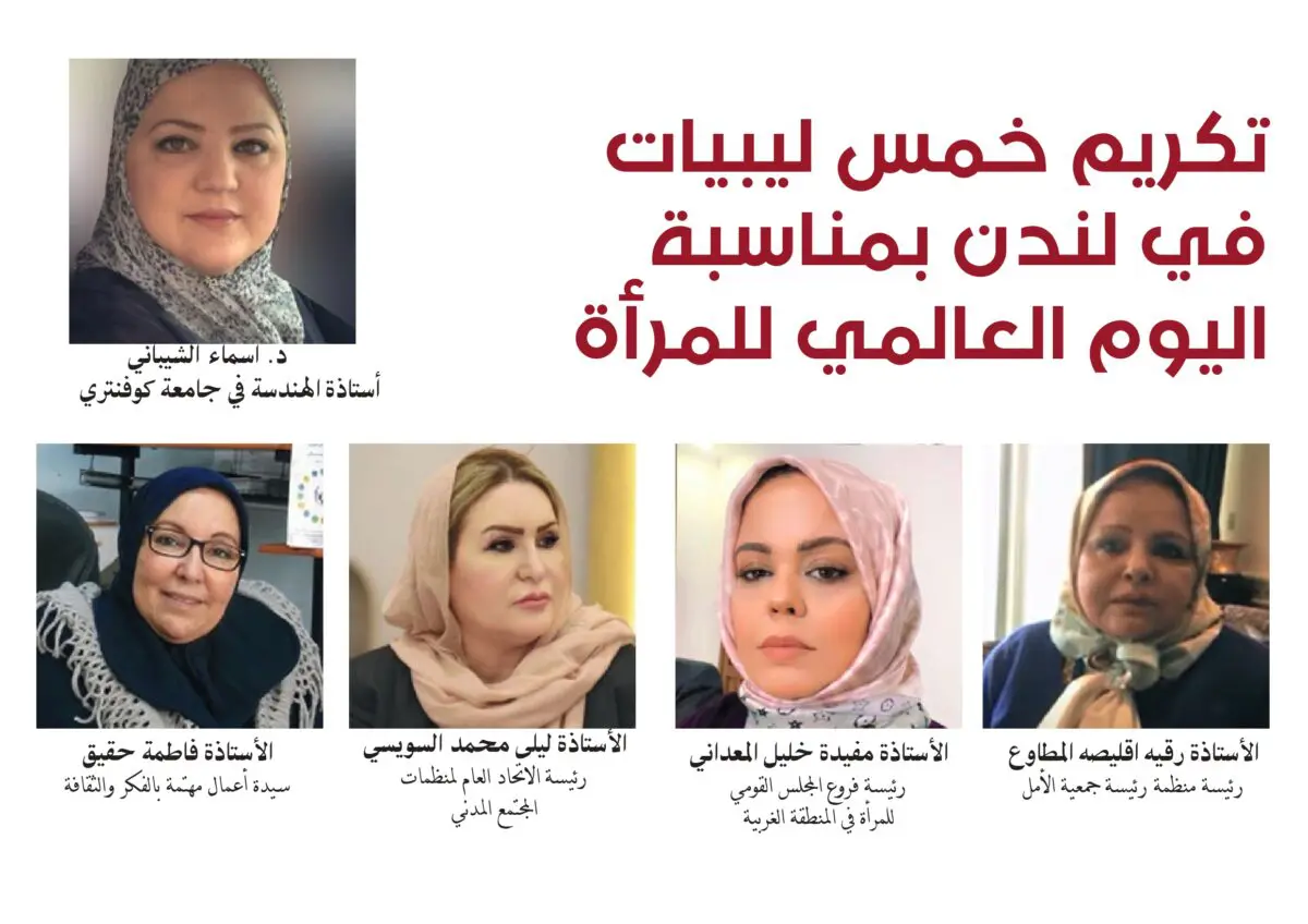 أما قائمة المكرمات من المركز العربي الأوروبي لحقوق الإنسان والقانون الدولي الذي يتخذ من أسلو مقرا له، فقد تضمنت 7 ليبيات متميزات في مختلف المجالات من مختلف مناطق ليبيا، وهن: