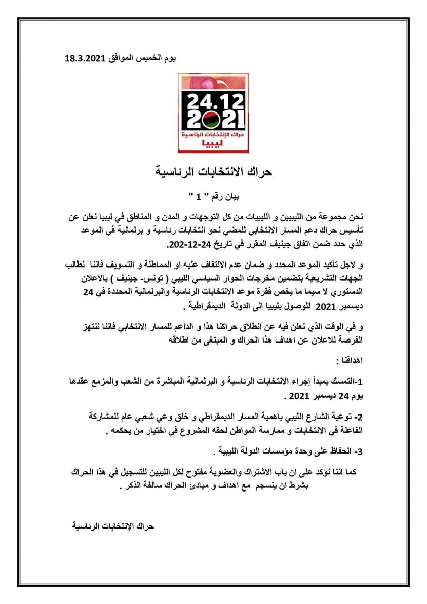 وفي بيانه الأول تحصلت “عين ليبيا” على نسخة منه، طالب الحراك “الجهات التشريعية بتضمين مخرجات الحوار السياسي الليبي (تونس . جنيف) بالإعلان الدستوري لا سيما ما يخص فقرة موعد الانتخابات الرئاسية والبرلمانية المحددة في 24 ديسمبر 2021 للوصول بليبيا إلى الدولة الديمقراطية”.