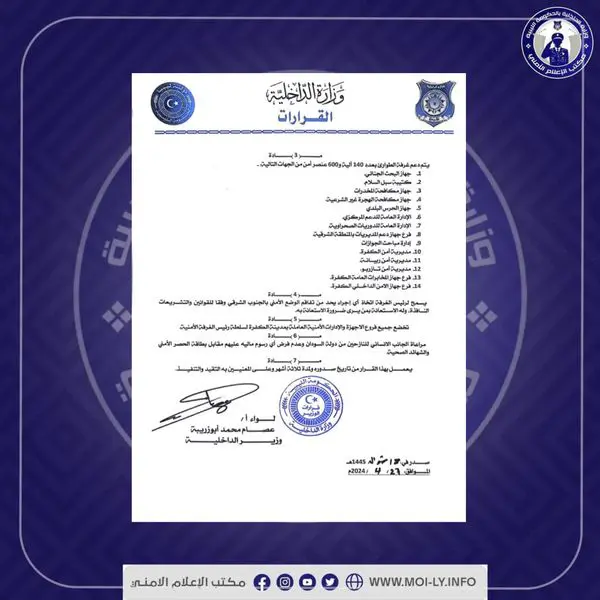 أصدر وزير الداخلية بالحكومة الليبية المُكلفة من مجلس النوّاب اللواء عصام أبوزريبة، القرار رقم (203) لسنة 2024م، “القاضي بتشكيل غرفة طوارئ أمنية مشتركة في منطقة الجنوب الشرقي.