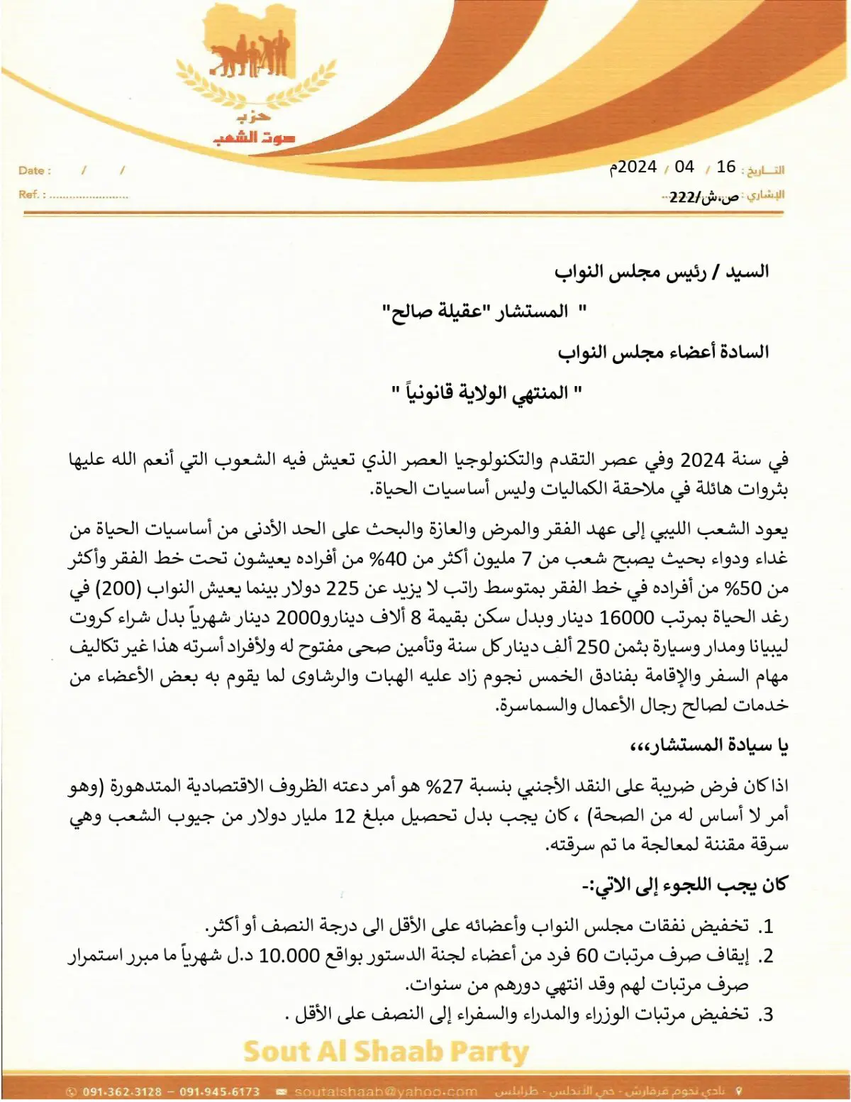 جاء ذلك في رسالة وجهها الحزب إلى رئيس وأعضاء مجلس النوّاب، تحصلت “عين ليبيا” على نسخة منها.