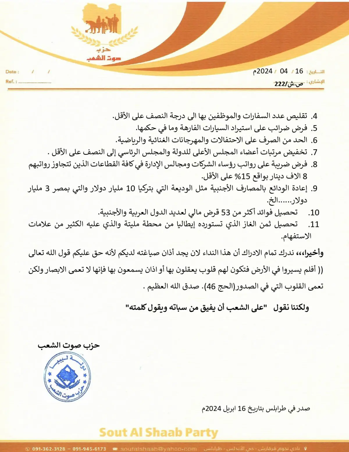 ونوه الحزب في بيانه إلى أنه كان يجب اللجوء إلى عدة خطوات لتحسين الظروف الاقتصادية المتدهور والتي تتمثل في: