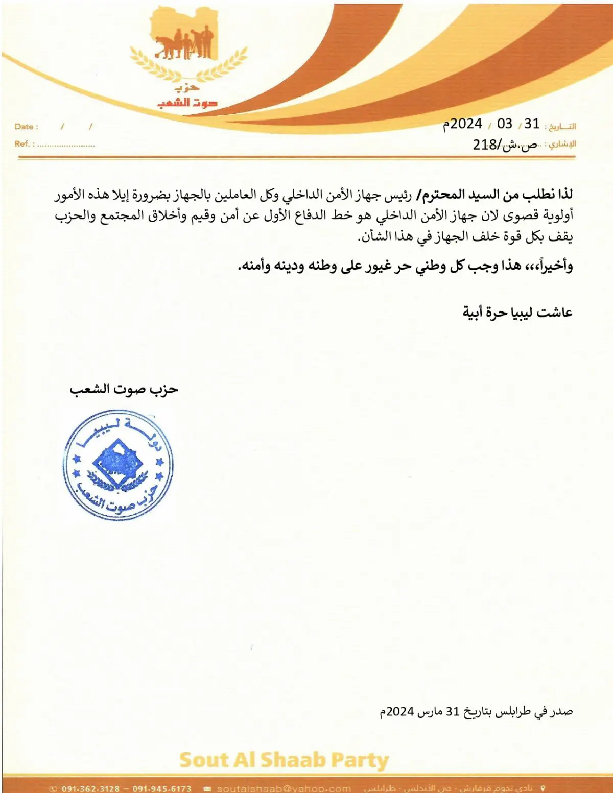 كما طالب حزب صوت الشعب من جهاز الأمن الداخلي بضرورة إيلاء هذه الأمور أولوية قصوى لأن جهاز الأمن الداخلي هو خط الدفاع الأول عن أمن وقيم وأخلاق المجتمع، مؤكدا وقوفه بكل قوة خلف الجهاز في هذا الشأن.
