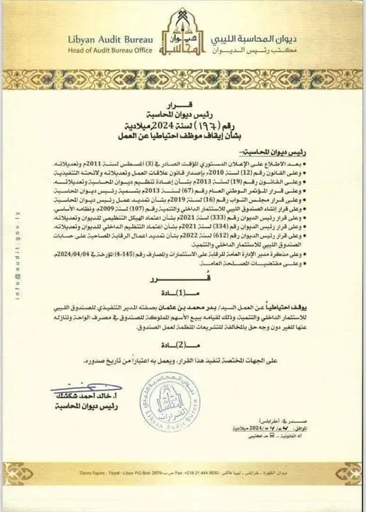 قرر رئيس ديوان المحاسبة خالد شكشك، إيقاف المدير التنفيذي للصندوق الليبي للاستثمار الداخلي والتنمية بدر محمد بن عثمان، احتياطياً عن العمل.