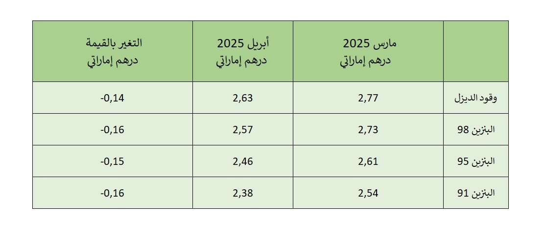 أعلنت الإمارات عن خفض أسعار الوقود لشهر أبريل 2025، وفق ما أقرت لجنة متابعة الأسعار.