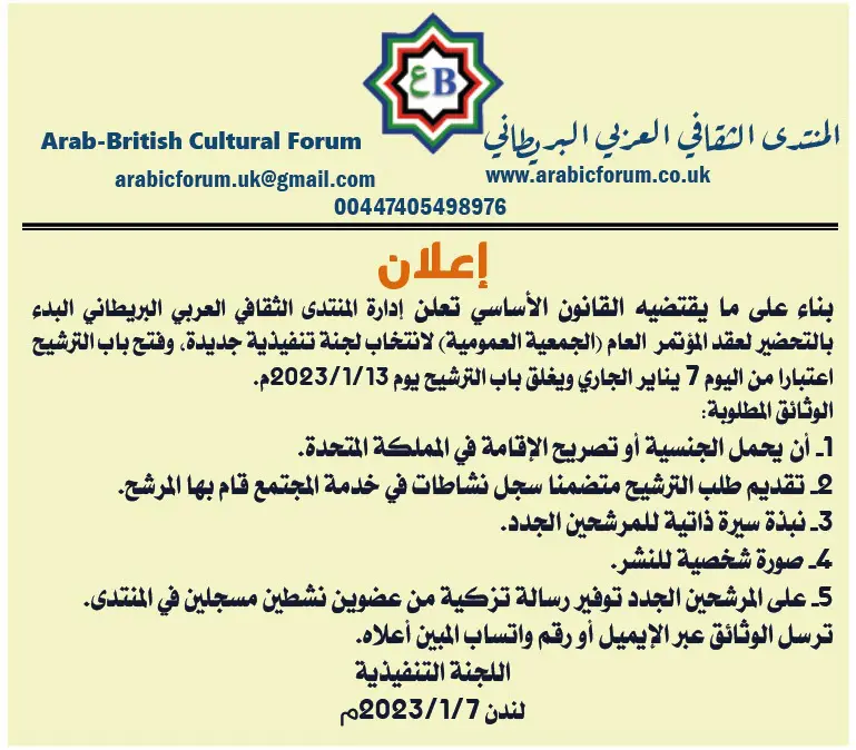 يُشار إلى أن أن المنتدى تأسس في لندن قبل 32 عاما ويتوارثه أبناء الجالية من المثقفين العرب والناطقين بالعربية، ويحتضن كوادر وخبرات مهنية ذات كفاءة عالية في مختلف المجالات والتخصصات.