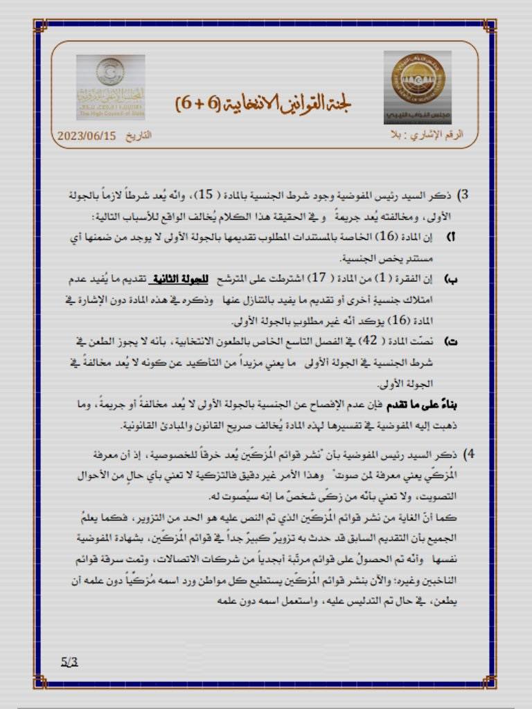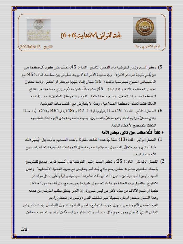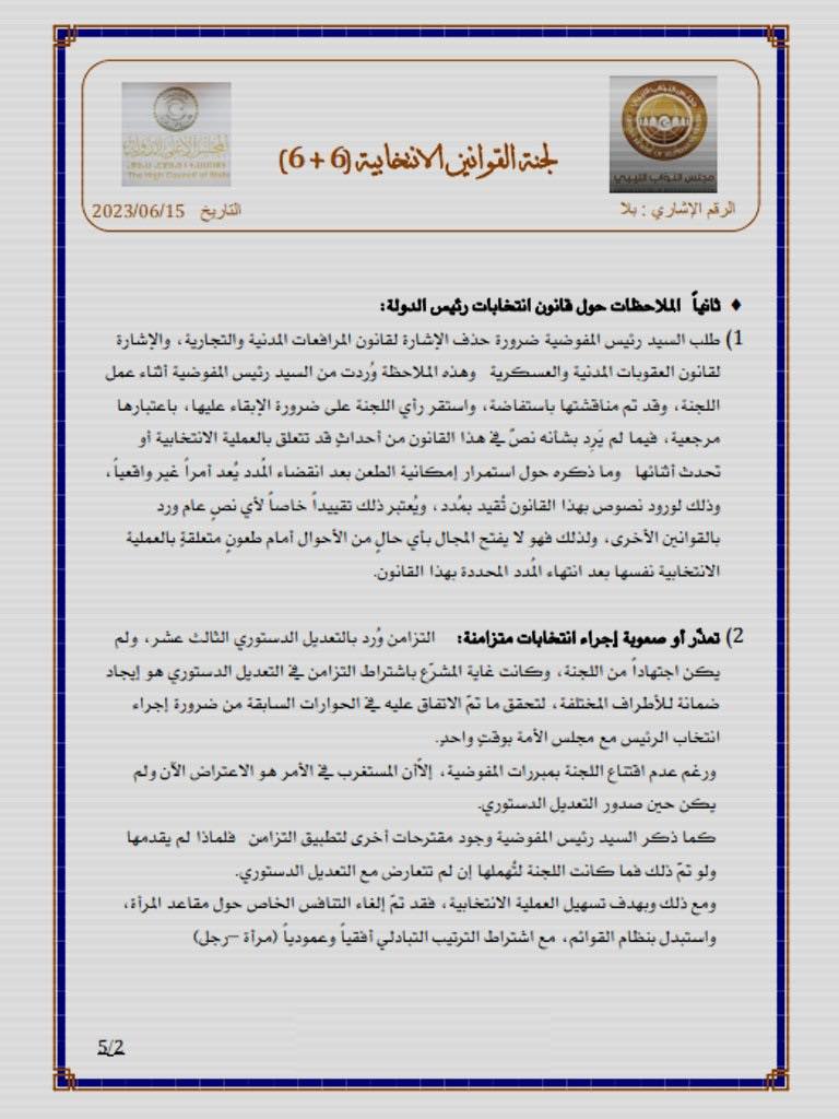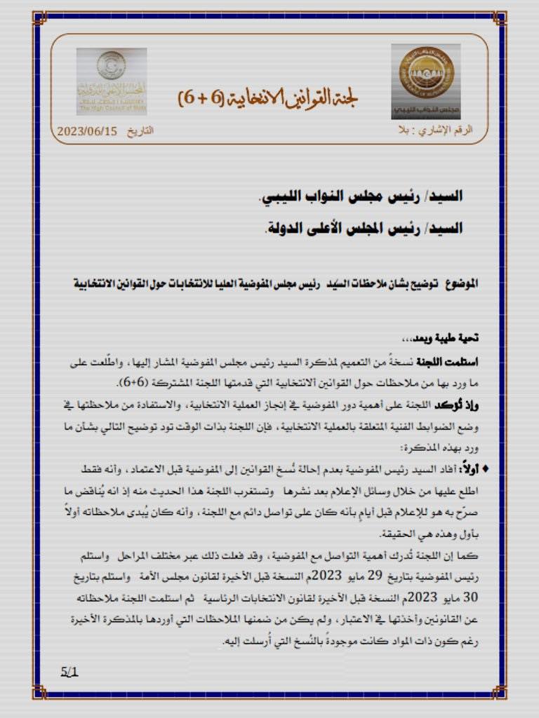 وأكد بيان اللجنة أن رئيس مفوضية الانتخابات كان على تواصل دائم مع لجنة 6+6 وأحالت إليه النسخ قبل الأخيرة بشأن قوانين انتخاب الرئيس ومجلس الأمة.