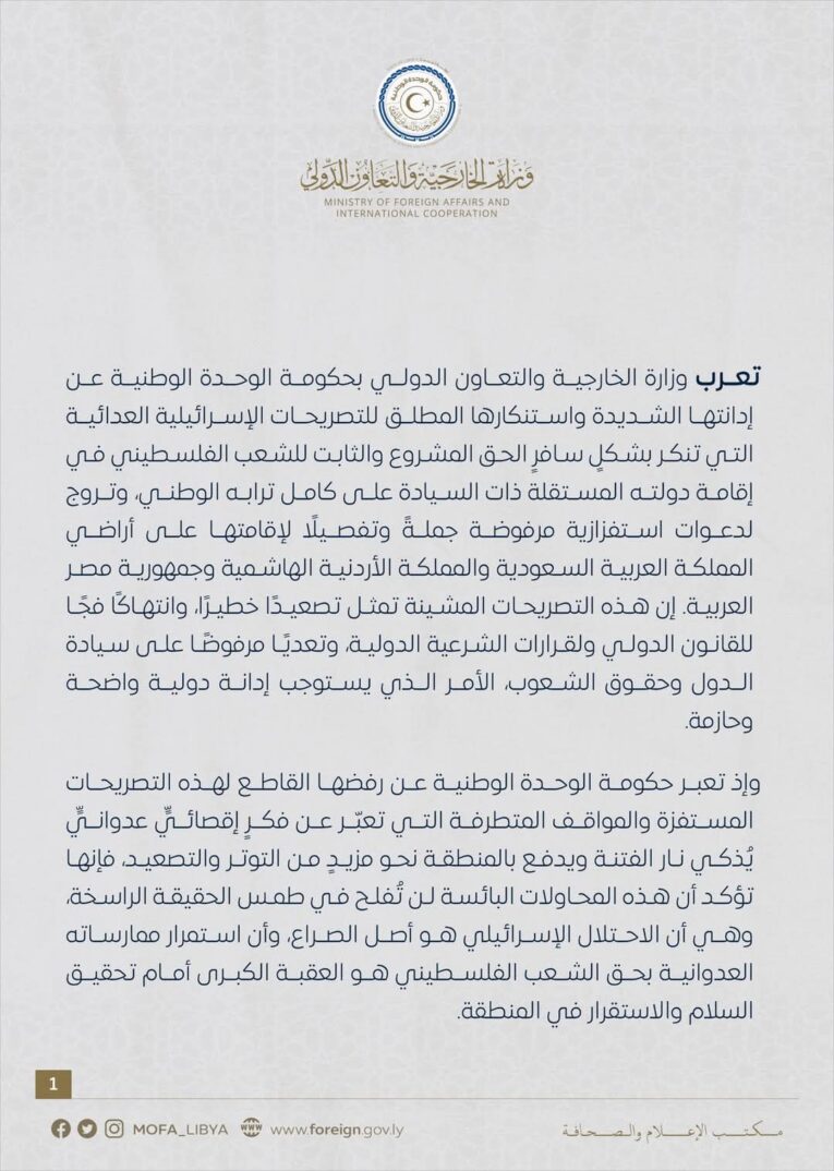 وقالت الخارجية في بيان: “تعرب الوزارة، عن إدانتها الشديدة واستنكارها المطلق للتصريحات الإسرائيلية العدائية التي تنكر بشكلٍ سافرٍ الحق المشروع والثابت للشعب الفلسطيني في إقامة دولته المستقلة ذات السيادة على كامل ترابه الوطني، وتروج لدعوات استفزازية مرفوضة جملةً وتفصيلًا لإقامتها على أراضي المملكة العربية السعودية والمملكة الأردنية الهاشمية وجمهورية مصر العربية”.