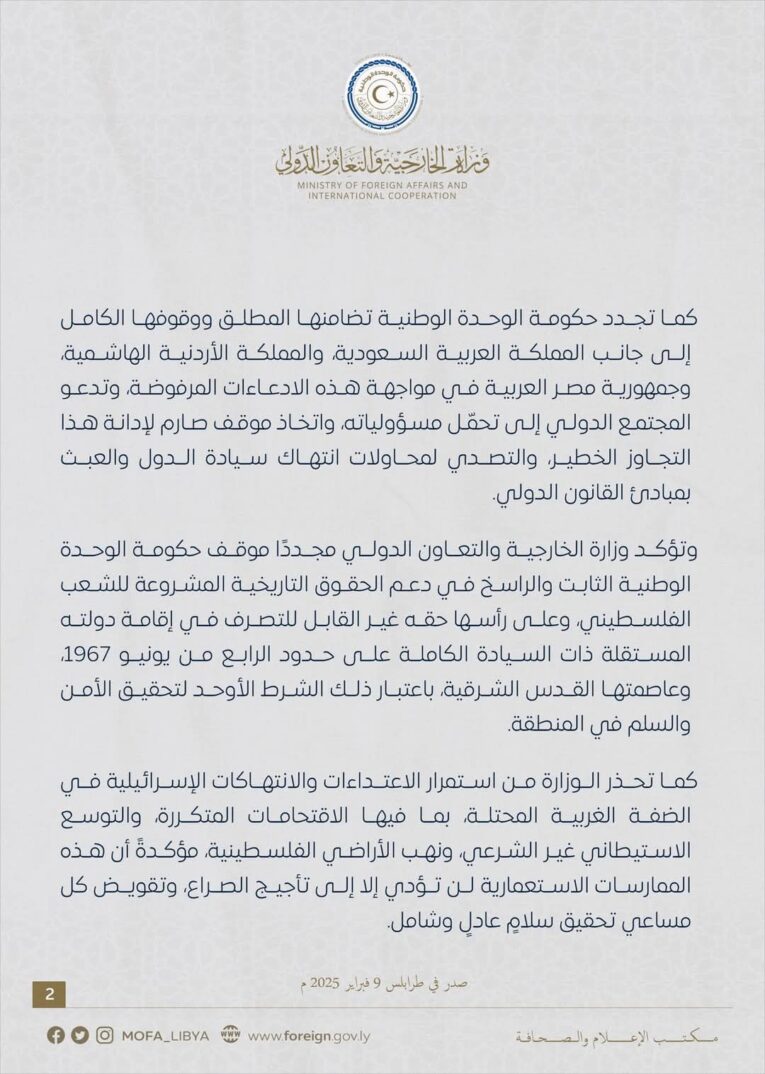 وأضاف البيان: “وإذ تعبر حكومة الوحدة الوطنية عن رفضها القاطع لهذه التصريحات المستفزة والمواقف المتطرفة التي تعبّر عن فكر إقصائي عدواني يُذكي نار الفتنة ويدفع بالمنطقة نحو مزيد من التوتر والتصعيد، فإنها تؤكد أن هذه المحاولات البائسة لن تفلح في طمس الحقيقة الراسخة وهي أن الاحتلال الإسرائيلي هو أصل الصراع، وأن استمرار ممارساته العدوانية بحق الشعب الفلسطيني هو العقبة الكبرى أمام تحقيق السلام والاستقرار في المنطقة”.