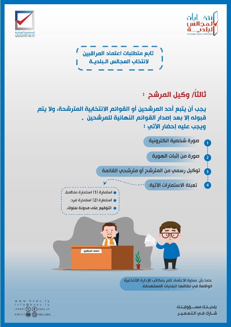 ثالثاً- وكيل المرشح: “يجب أن يتبع أحد المرشحين أو القوائم الانتخابية المترشحة، ولا يتم قبوله إلا بعد إصدار القوائم النهائية للمرشحين، ويجب عليه إحضار الآتي: صورة شخصية الكترونية، صورة من إثبات الهوية، توكيل رسمي من المترشح أو مترشحي القائمة، تعبئة الاستمارات الآتية: استمارة (1) استمارة منظمة، استمارة (2) استمارة فرد، التوقيع على مدونة سلوك”.