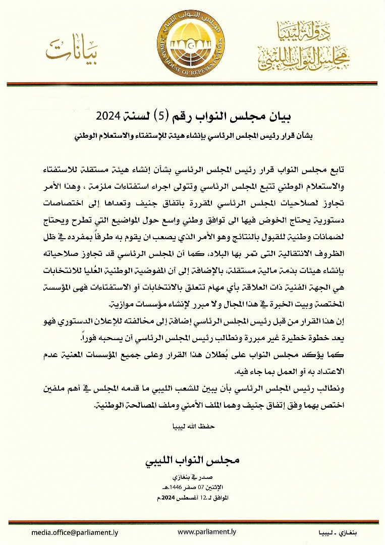 أصدر مجلس النواب بياناً وصف فيه “قرار المجلس الرئاسي بإنشاء هيئة للاستفتاء والاستعلام الوطني بالقرار الباطل وطالب الرئاسي بسحبه فوراً”.