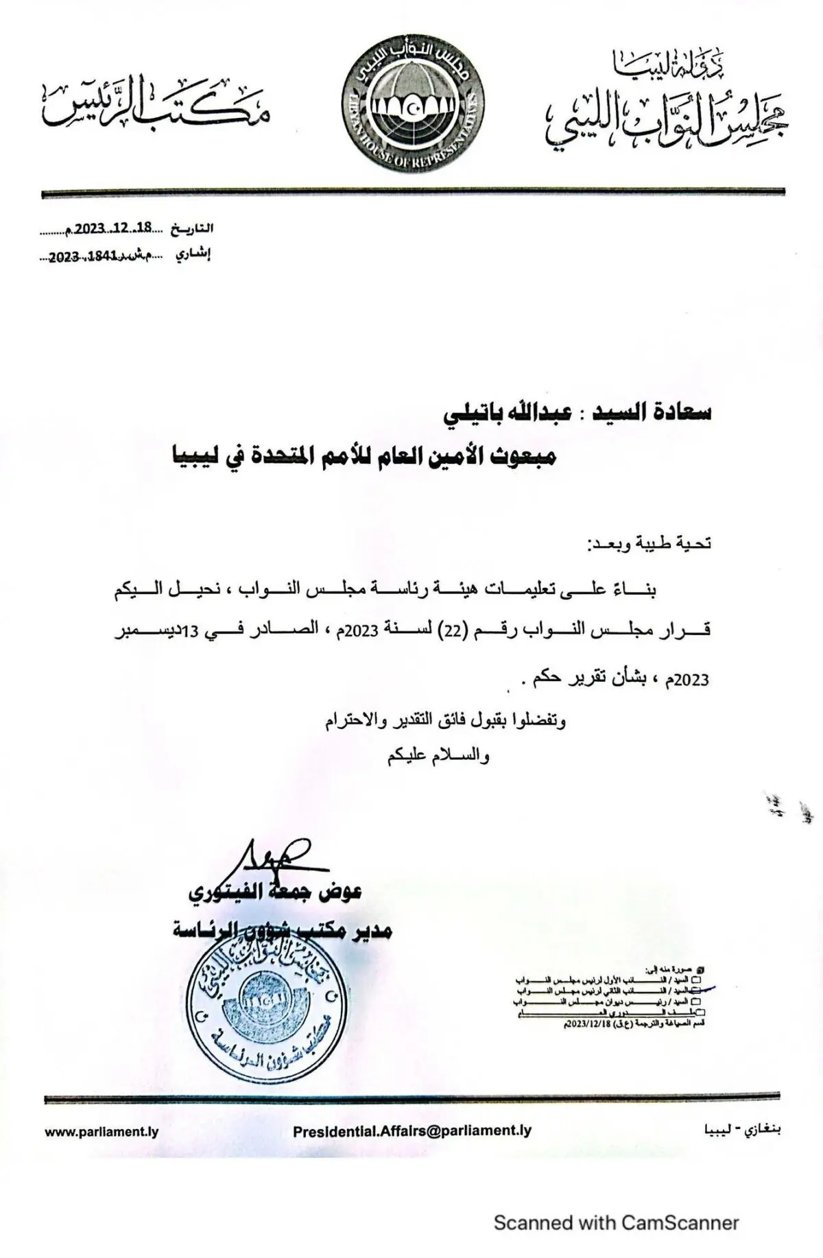 أصدر مجلس النوّاب القرار رقم 22 لسنة 2023م، والذي نص على رفض مشاركة المجلس في أي حوار سياسي بمشاركة حكومة الوحدة الوطنية برئاسة عبد الحميد الدبيبة والتي وصفها بالحكومة منتهية الولاية.
