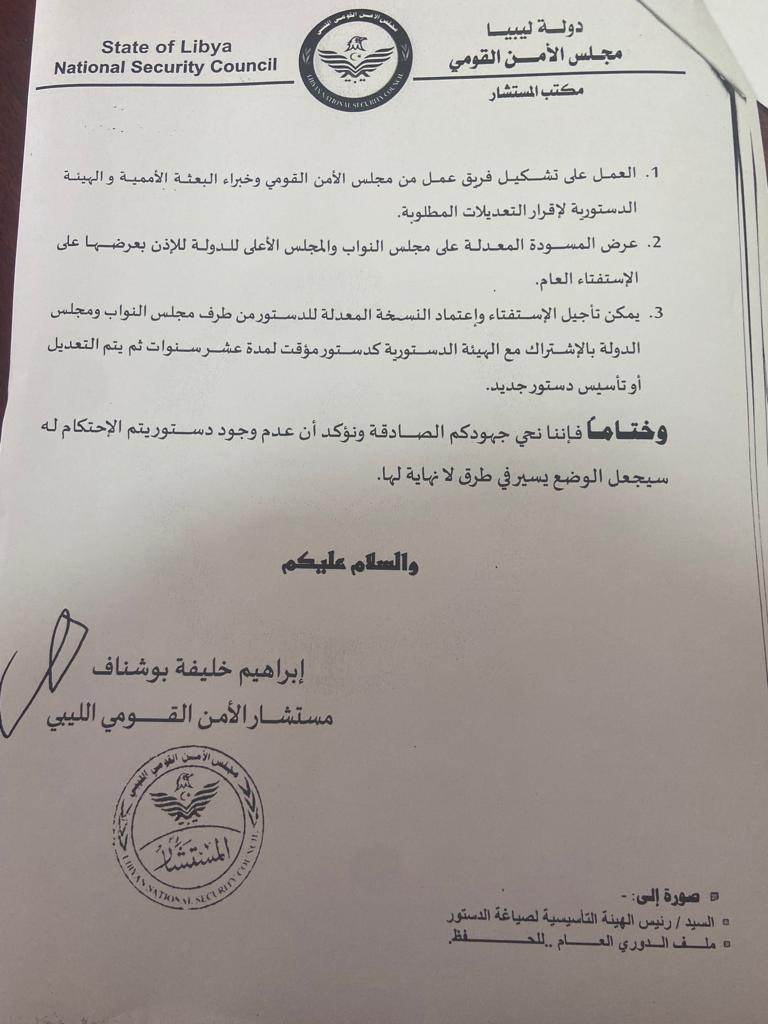 وفي رسالة موجهة للمبعوث الأممي عبد الله باتيلي تحصلت “عين ليبيا” على نسخة منها، اقترح بوشناف تشكيل فريق عمل من مجلس الأمن القومي الليبي، وخبراء البعثة الأممية، مع الهيئة التأسيسية لصياغة مشروع الدستور، وذلك لإقرار التعديلات الدستورية المطلوبة على مسودة الدستور المعتمدة من الهيئة.