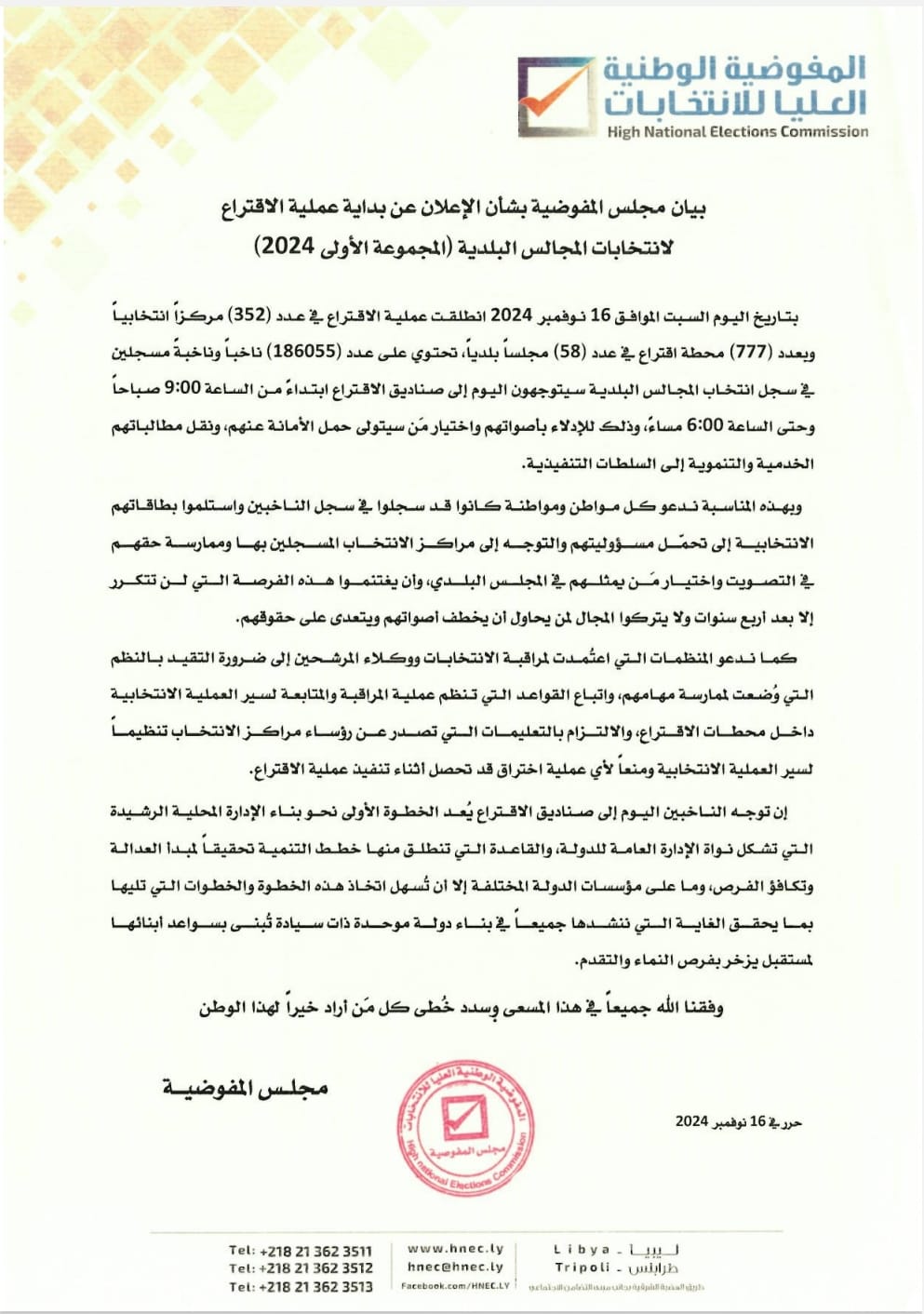 وجاء في البيان: “بتاريخ اليوم السبت الموافق 16 نوفمبر 2024 انطلقت عملية الاقتراع في عدد (352) مركزاً انتخابياً وبعدد (777) محطة اقتراع في عدد (58) مجلساً بلدياً، تحتوي على عدد (186055) ناخباً وناخبة مسجلين في سجل انتخاب المجالس البلدية سيتوجهون اليوم إلى صناديق الاقتراع ابتداءً من الساعة 9:00 صباحاً وحتى الساعة 6:00 مساءً، وذلك للإدلاء بأصواتهم واختيار من سيتولى حمل الأمانة عنهم، ونقل مطالباتهم الخدمية والتنموية إلى السلطات التنفيذية”.
