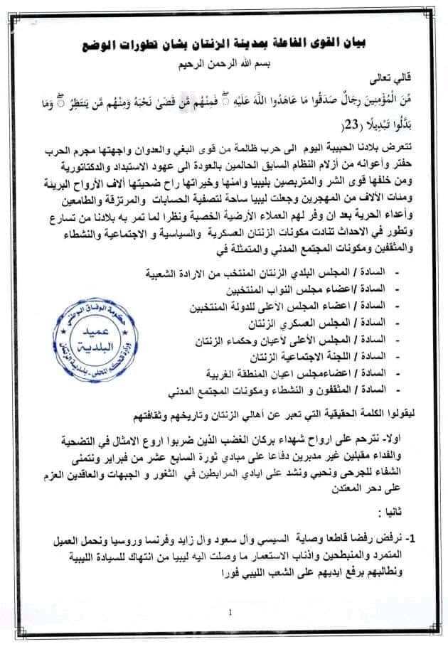 جاء ذلك في بيان مشترك، السبت، للمجلس البلدي وأعضاء مجلسي النواب والدولة والمجلسين العسكري والأعيان واللجنة الاجتماعية وأعضاء مجلس أعيان المنطقة الغربية والمثقفين والنشطاء ومكونات المجتمع المدني بمدينة الزنتان.