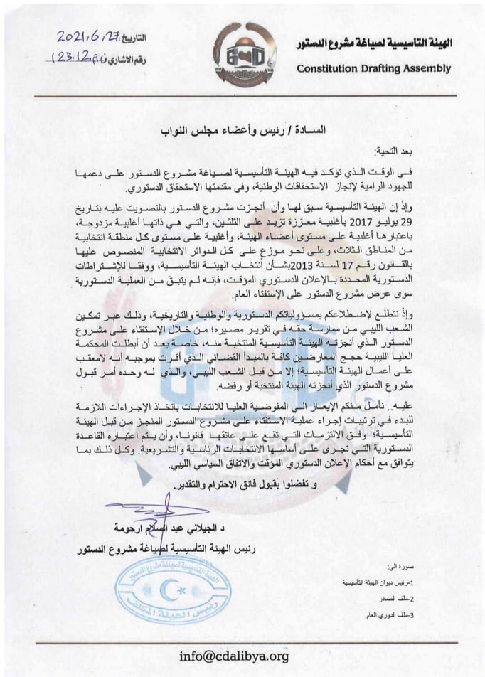 طالب رئيس الهيئة التأسيسية لصياغة مشروع الدستور الجيلاني ارحومة، باتخاذ الإجراءات اللازمة للبدء في ترتيبات عملية الاستفتاء على مشروع الدستور، واعتباره القاعدة الدستورية التي تُجرى على أساسها الانتخابات القادمة المقررة في 24 ديسمبر 2021.