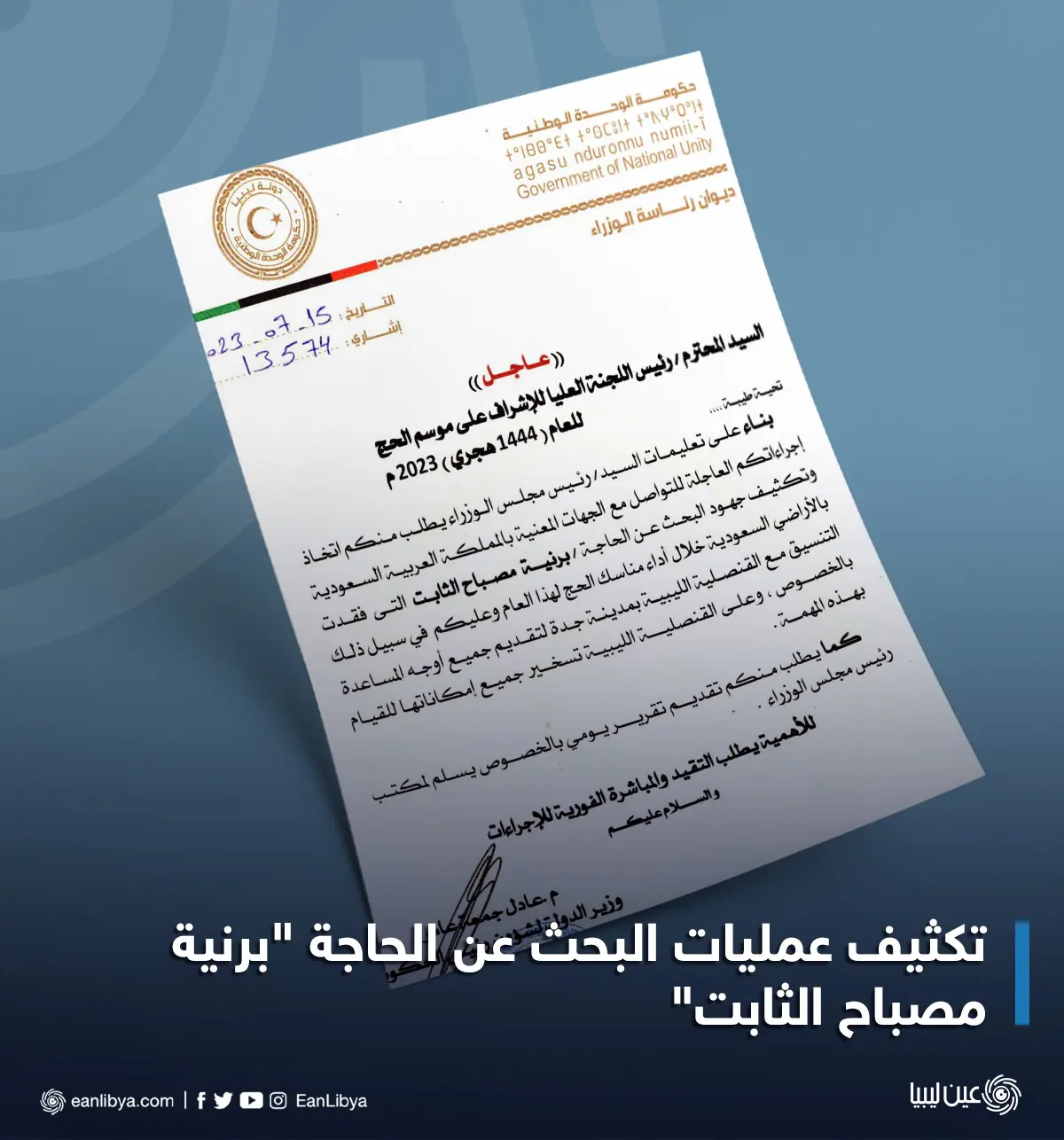 يأتي ذلك في حين، وجه رئيس حكومة الوحدة الوطنية عبد الحميد الدبيبة، اللجنة العليا للإشراف على موسم الحج بتكثيف عمليات البحث عن الحاجة “برنية مصباح الثابت” التي فُقِدت أثناء أداء مناسك الحج للعام 1444 هجري.