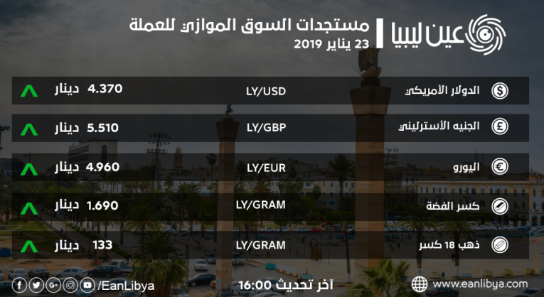 هذا وسجل سعر اليورو الأوروبي مقابل الدينار الليبي ارتفاعاً طفيفاً مع بدء تعاملات السوق الموازي وبلغ سعره اليوم «4,960» دينار ليبي مقارنة بـ «4.940» عند الإغلاق بالأمس، حيث تعرضت العملة الأوروبية في منتصف شهر يناير من هذه السنة إلى هبوط قاسي لم تشهده منذ أكثر من عام.