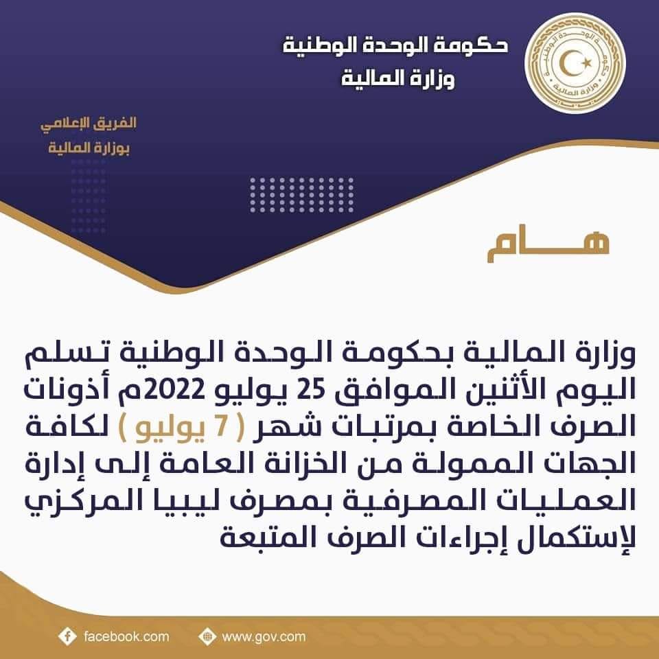 وتم تسليم أذونات الصرف الخاصة بمرتبات شهر يوليو الجاري، إلى مصرف ليبيا المركزي لاستكمال إجراءات تسييلها إلى حسابات الجهات العامة.