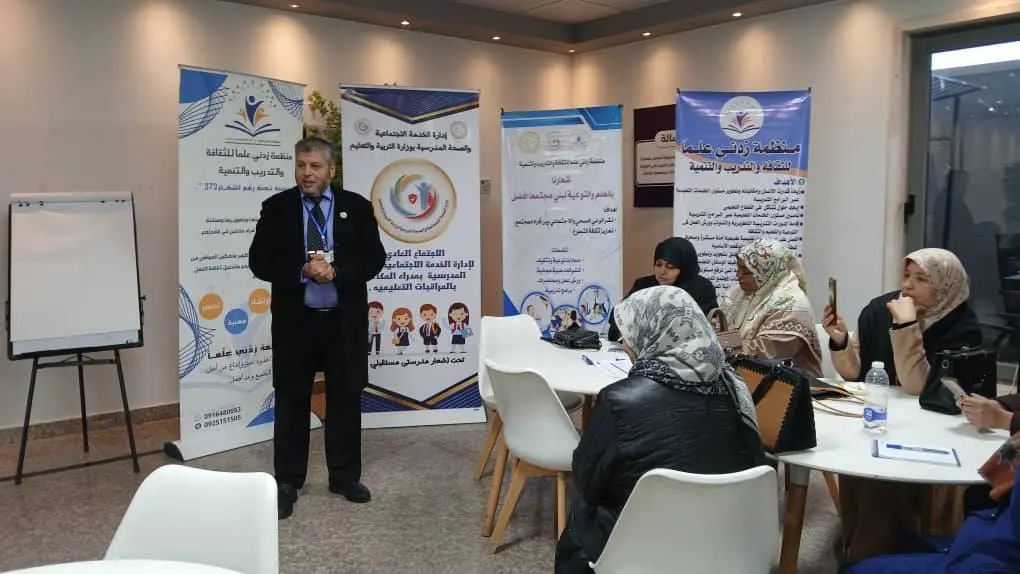 وشملت الورشة ثلاثين أخصائيًا اجتماعيًا من مراقبات التربية والتعليم في بلديات جنزور وأبوسليم وعين زارة، ضمن برنامج تدريبي هدف إلى تعزيز الدور المهني للأخصائي الاجتماعي داخل البيئة المدرسية، ودعم قدراته في تقديم خدمات اجتماعية ونفسية متخصصة للطلاب.