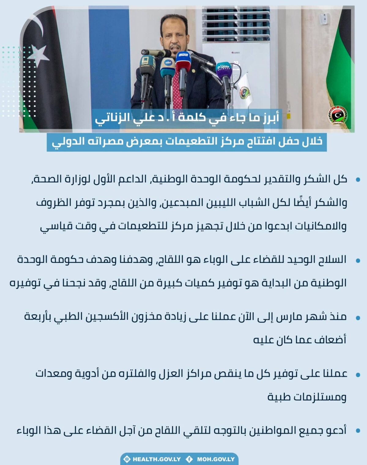 افتتح وزير الصحة بحكومة الوحدة الوطنية الدكتور علي الزناتي، وبرعاية رئيس الحكومة عبد الحميد الدبيبة، اليوم الخميس، مركز التطعيمات الثالث بمعرض مصراته الطبي، معلنًا بذلك انطلاق الحملة الوطنية الاستتنائية للتطعيم ضد فيروس كورونا بمدينة مصراته.