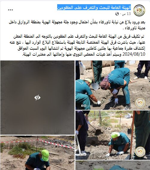 أعلنت الهيئة العامة للبحث والتعرف على المفقودين، “عن اكتشاف مقبرة جماعية فيها جثتين بمنطقة الروازق داخل مدينة تاورغاء”.