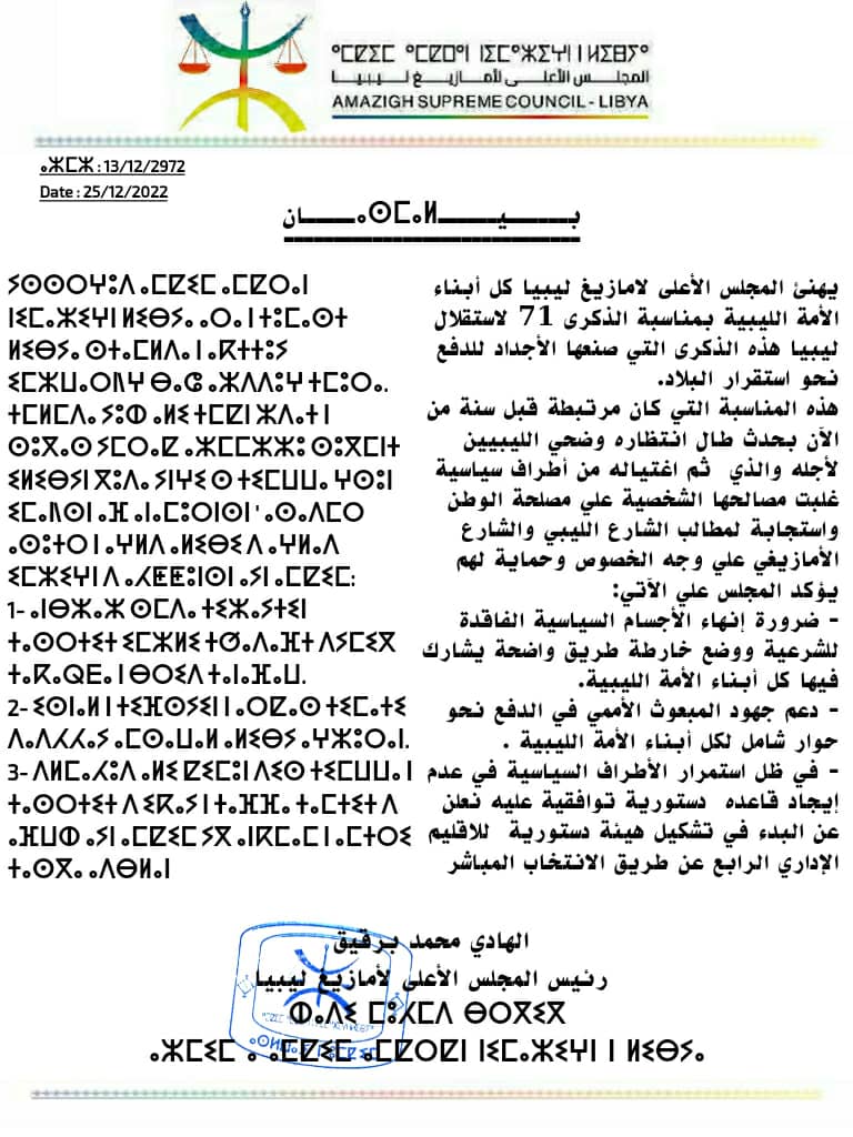 قال رئيس المجلس الأعلى لأمازيغ ليبيا الهادي برقيق إنّ ذكرى الاستقلال مرتبطة بذكرى الانتخابات وهي حدث طال انتظاره وضحى الليبيون من أجله، وتم اغتياله من الأطراف السياسية.