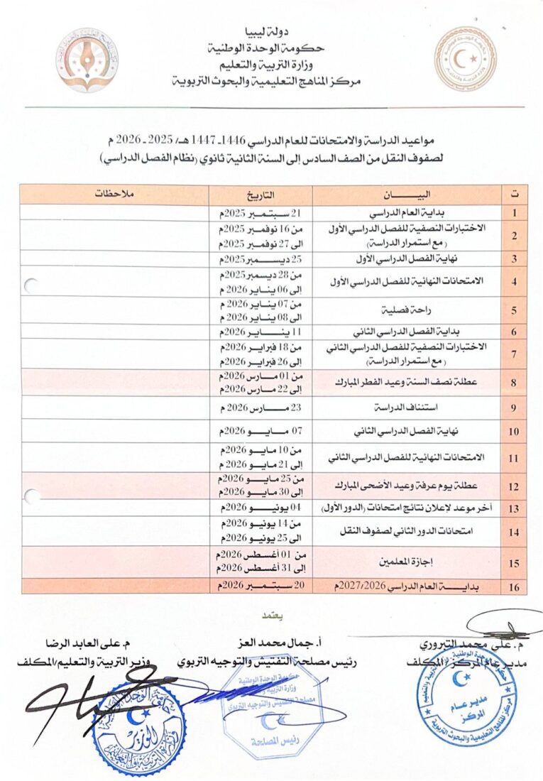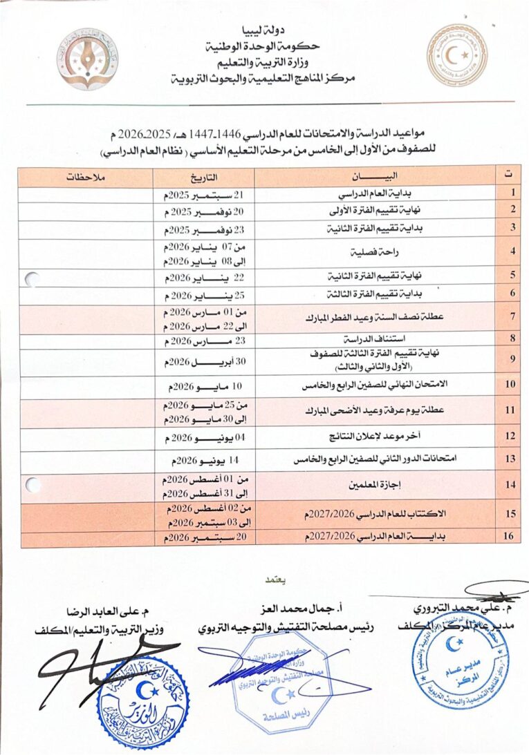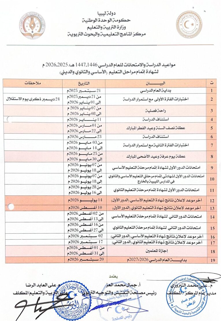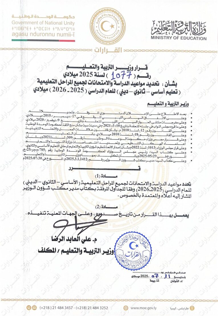 أصدرت وزارة التربية والتعليم بحكومة الوحدة الوطنية، قرار وزير التربية والتعليم المكلف المهندس علي العابد رقم (1077) لسنة 2025 ميلادي، والذي يحدد مواعيد الدراسة والامتحانات لجميع المراحل التعليمية (الأساسي، الثانوي، والديني) للعام الدراسي 2025-2026.