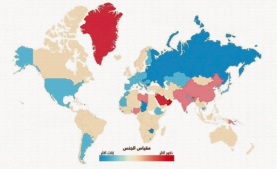 إن الخريطة المرفقة تتناول وتشرح بالتفصيل الفروق والتباينات في معدل الجنسين في دول العالم بحسب الإحصائيات والمعطيات الرسمية.