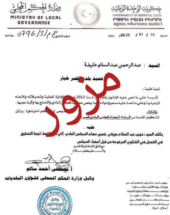 أعلنت وزارة الحكم المحلي يحكومة الوحدة الوطنية، أن المستند المتداول على بعض صفحات التواصل الاجتماعي والمنسوب إليها بتاريخ 15 يناير 2026، مزور بالكامل ولا يمت بأي صلة للوزارة.