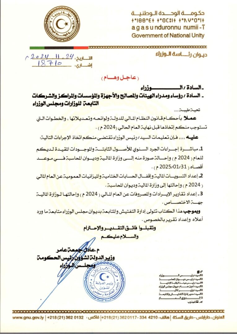 أصدر رئيس حكومة الوحدة الوطنية عبد الحميد الدبيبة، قرارا يلزم الجهات الحكومية بمباشرة الجرد السنوي، والتسويات المالية واقفال الحسابات والميزانية، وإعداد التقارير المالية السنوية لعام 2024 وتقديمها قبل نهاية العام.