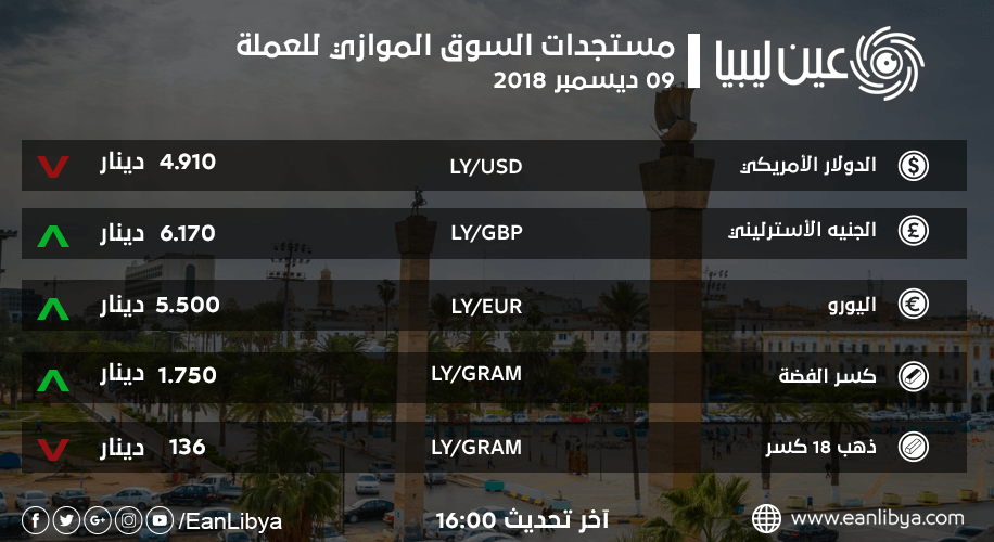 هذا وسجل سعر اليورو الأوروبي مقابل الدينار الليبي ارتفاعاً طفيفاً مع بدء تعاملات السوق الموازي وبلغ سعره اليوم «5,500» دينار ليبي مقارنة بـ «5.420» عند الإغلاق بالأمس، حيث تعرضت العملة الأوروبية في منتصف شهر يناير من هذه السنة إلى هبوط قاسي لم تشهده منذ أكثر من عام.