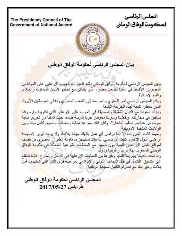 أدان المجلس الرئاسي لحكومة الوفاق الوطني الهجوم على الأقباط المصريين في المينا بصعيد مصر.