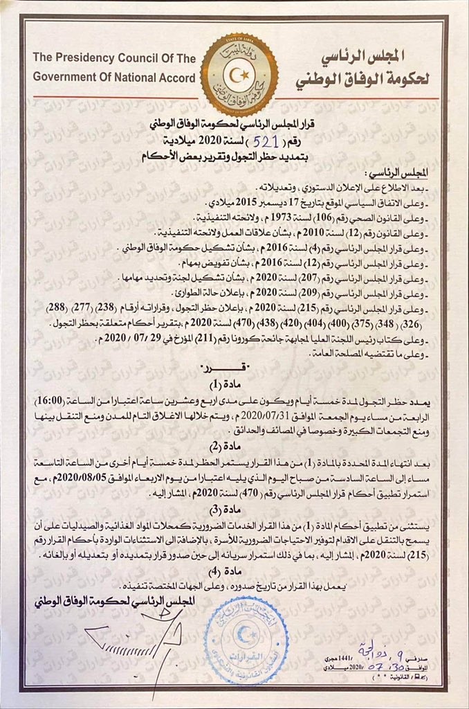أصدر المجلس الرئاسي لحكومة الوفاق الوطني، اليوم الخميس، القرار رقم 521 لسنة 2020، بتمديد حظر التجول وتقرير بعض الأحكام.