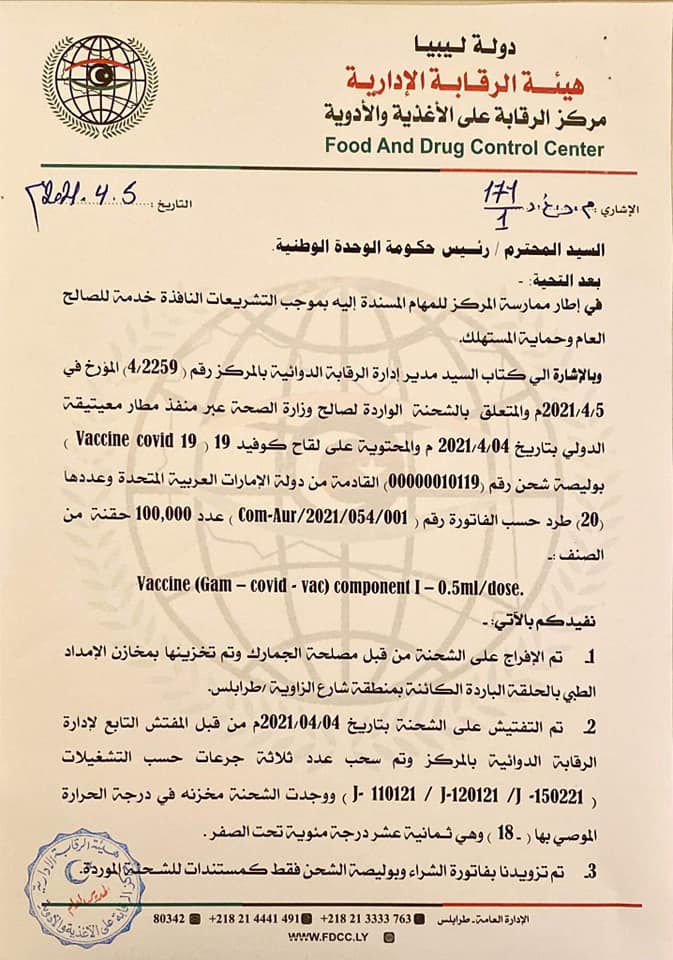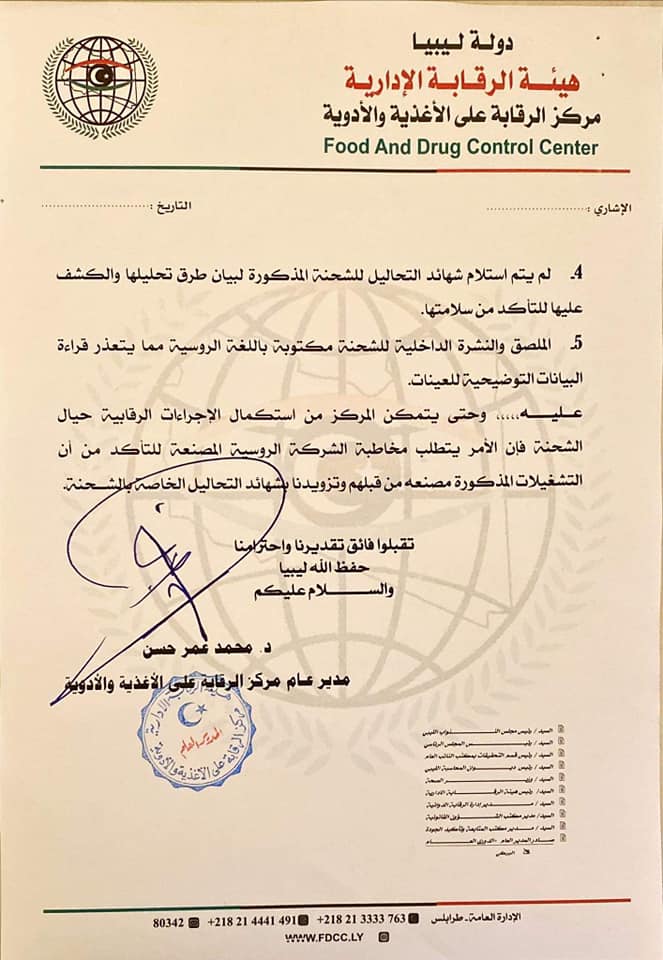 وفي وقت سابق، وجه مدير عـام مـركز الـرقـابة علـى الأغــذية والأدويــة د. محمد عمر حسن، إلى رئيس حكومة الوحدة الوطنية حول ضرورة مخاطبة الشركة الروسية المصنعة للقاح كورونا للتأكد من أن التشغيلات الخاصة بالعينات المسحوبة مصنعة من قبلهم وتزويده بشهائد التحاليل الخاصة بالشحنة، بالإضافة إلي أن النشرة التوضيحية المرفقة للقاح مدونة باللغة الروسية وهذا يخالف نص القانون الصحي رقم 106 لسنة 1973 حول ضرورة كتابة النشرة التوضيحية باللغة الإنجليزية.