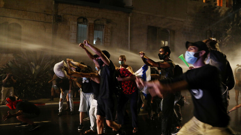 ووفق ماذكرت قناة “روسيا اليوم” عن القناة الـ12 الصهيونية بأن الشرطة استخدمت خراطيم المياه لتفريق المحتجين، مضيفة أن عمود المياه القوية ضرب طفلين في موقع المظاهرة، دون تعرضهما لجروح.